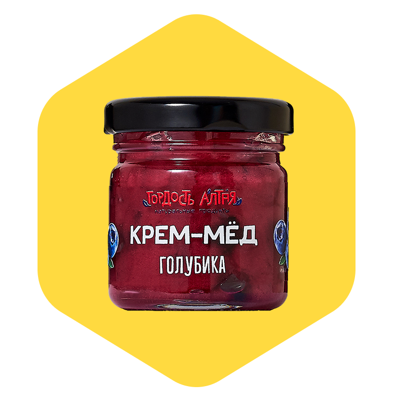 Крем-мёд с голубикой — это натуральный десерт с нежной кремовой текстурой, ярким ягодным вкусом и сбалансированной сладостью. Основу продукта составляет взбитый крем-мёд, приготовленный из цветочного мёда Алтая. В него добавлены фрагменты голубики и натуральный концентрированный или лиофилизированный сок, чтобы усилить вкус и аромат без использования ароматизаторов. Благодаря технологии холодного взбивания крем-мёд сохраняет все полезные свойства меда, остаётся пластичным, легко намазывается и не течёт. Голубика придаёт ему лёгкую кислинку и насыщенный цвет, делая этот продукт отличным выбором для здорового сладкого перекуса.